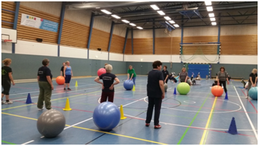 Es wird auch mal ein Linedance mit Musik versucht und wir greifen in die Boxen mit den Volleybällen und probieren uns damit aus.