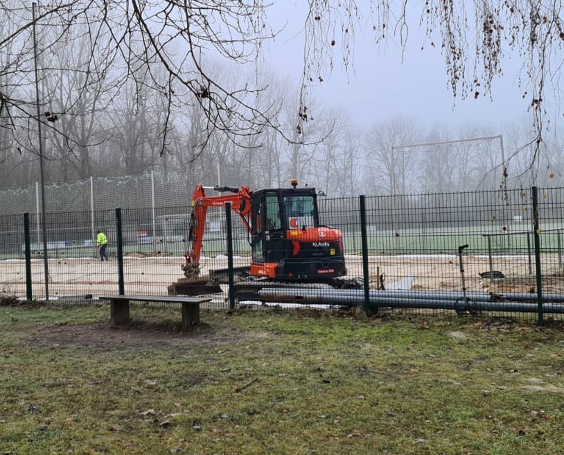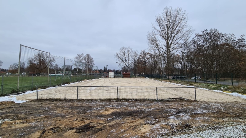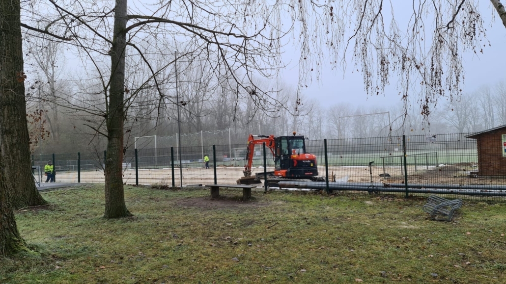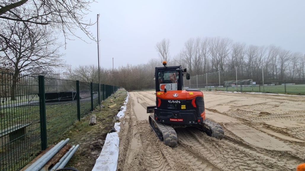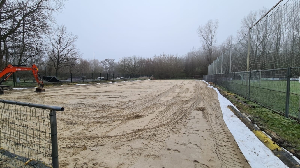 So konnten bereits die Netzpfosten eingebracht, die Randkanten begradigt, Courtlines gelegt und Verankerungen gesetzt werden.